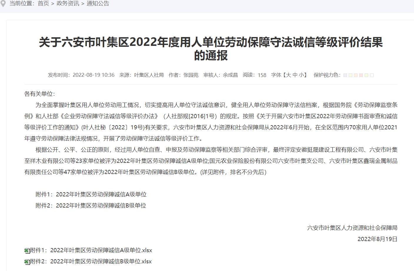 公司荣获六安市叶集区2022年度用人单位劳动保障守法诚信等级评价A级单位
